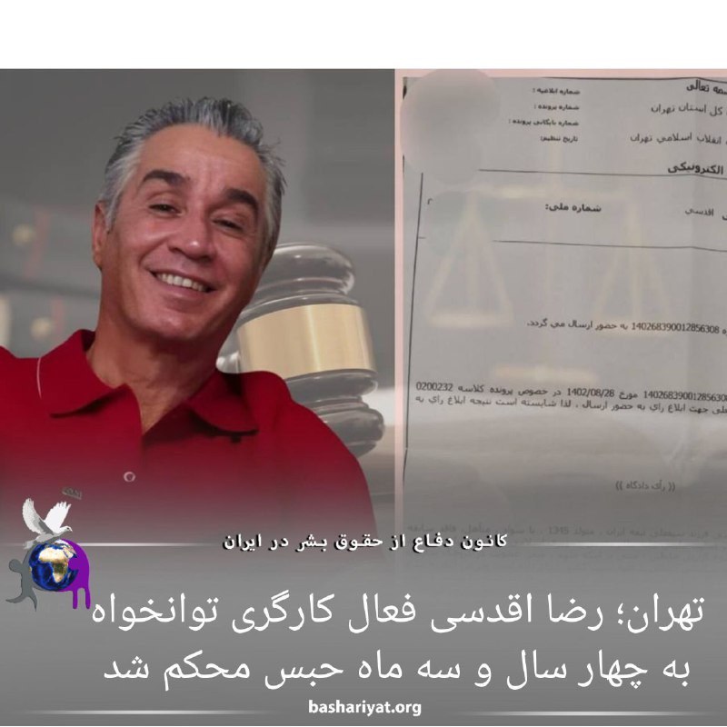 پنجشنبه ۹ آذر ۱۴۰۲ رضا_اقدسی ، فعال کارگری توانخواه و از کارگران اخراجی #شرکت_ایران_خودرو توسط دستگاه قضایی جمهوری اسلامی ایران به چهار سال و سه ماه حبس تعزیری محکوم شد.