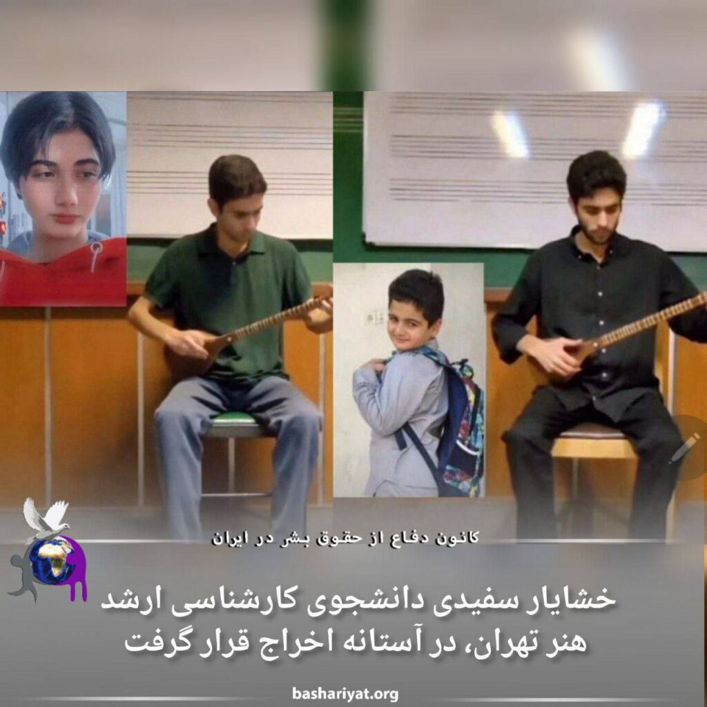 #خشایار_سفیدی، دانشجوی کارشناسی ارشد موسیقی دانشگاه هنر تهران به دنبال انتشار دو اجرای موسیقی در سوگ #کیان_پیرفلک و #آرمیتا_گراوند در آستانه اخراج از دانشگاه قرار گرفت. وی از مهر سال گذشته به دانشگاه ممنوعالورود بود و در ترم بعد با اجرای یک ترم تعلیق از تحصیل محروم شد، در چند روز گذشته با دخالت مستقیم کوروش نجفی، مدیر کل آموزش دانشگاه، به بهانه پایان سنوات تحصیلی در آستانه اخراج قرار گرفت.تعلیق خشایار سفیدی یک ترم بوده اما به مدت دوترم اجرا شده و دانشگاه به دروغ در کارنامه او نیم سال اول سال گذشته را «مشغول به تحصیل» و «وضعیت عادی» ثبت کرده است. در واقع دانشگاه هیچ مسئولیتی بابت یک ترم ممنوع الورود بودن او برعهده نگرفته و از اساس آن را کتمان میکنند!