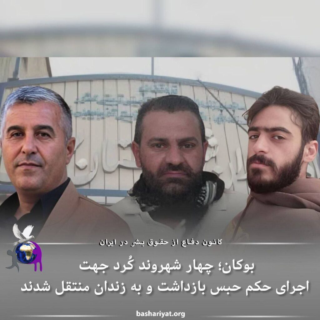 روز سهشنبه ۲۱ آذر ماه ١٤٠٢ (۱۲ دسامبر ٢٠٢٣)، جلال امینی و یونس محمودزاده، هرکدام جهت اجرای ٣٠ ماه حبس، #حسین_احمدی، ٢٧ ماه و #کاظم_مام_اسماعیل نیز، برای اجرای حکم ٩ ماه زندان، پس از احضار توسط شعبه اجرای احکام دادسرای بوکان، بازداشت و به زندان مرکزی این شهر منتقل شدند.حسین احمدی، پیشتر به ٣ سال حبس تعزیری، جلال امینی و یونس محمودزاده، هرکدام به ٣ سال و ٨ ماه حبس و همچنین، کاظم مام اسماعیل، به یک سال حبس تعزیری محکوم شده بودند. شعبه ١٠١ دادگاه کیفری بوکان، این شهروندان را به اتهام “همکاری با حزب حیات آزاد کُردستان (پژاک)” به حبس محکوم کرده و این احکام حبس، بعدها در مرحله تجدیدنظر کاهش پیدا کرد.