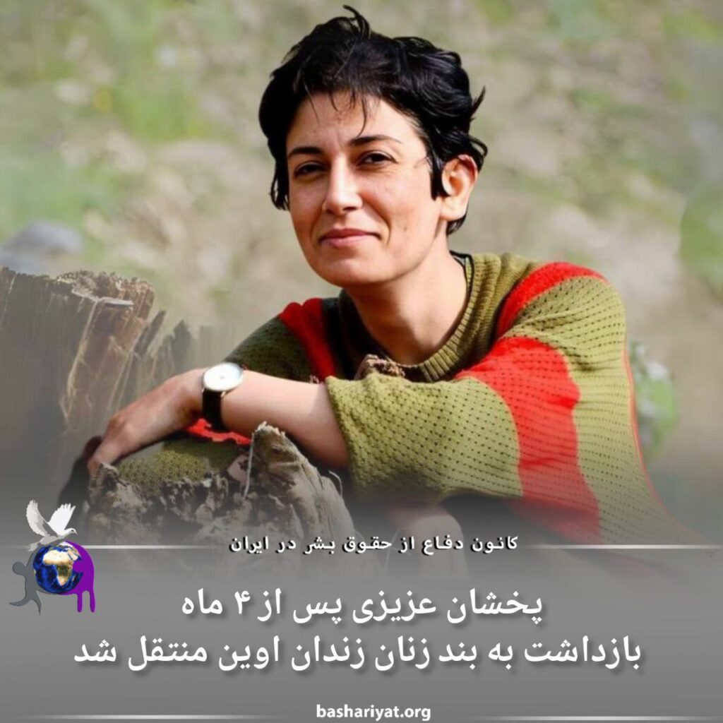 پخشان عزیزی، روزنامه‌نگار، مددکار اجتماعی و زندانی سیاسی سابق کُرد پس از ۴ ماه بازداشت از بند ٢٠٩ زندان اوین موسوم به بازداشتگاه وزارت اطلاعات به بند زنان زندان اوین منتقل شد.پخشان عزیزی در طی مدت سپری‌شده از بازداشت اخیر خود، از حق دسترسی به وکیل، ملاقات حضوری و همچنین برقراری تماس تلفنی با خانواده محروم بود.