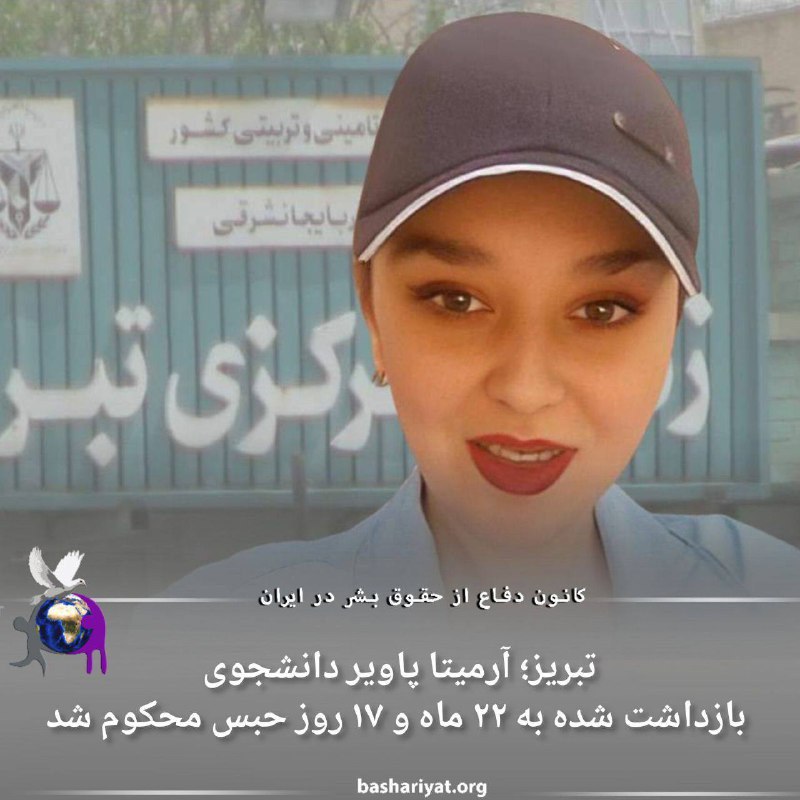 آرمیتا پاویر، فعال دانشجویی و از بازداشتشدگان جنبش زن، زندگی، آزادی، که اخیراً در زندان مرکزی تبریز دست به اعتصاب غذا زده بود، توسط دستگاه قضایی جمهوری اسلامی ایران به یک سال و ده ماه و هفده روز حبس محکوم شد.اخیراً آرمیتا پاویر، فعال دانشجویی اخراج شده دانشگاه مدنی آذربایجان توسط دادگاه انقلاب آذرشهر به اتهام “توهین به رهبری در فضای مجازی” به یک سال و سه ماه و یک روز و در ارتباط با اتهام “فعالیت تبلیغی علیه جمهوری اسلامی ایران” به هفت ماه و شانزده روز حبس تعزیری محکوم شده است.