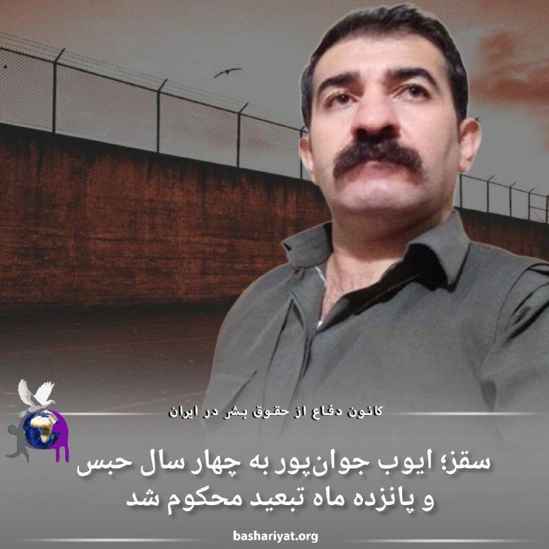 ایوب جوان پور، از آسیبدیدگان جنبش ژن ژیان ئازادی که شش ماه اخیر را در بازداشت سپری کرده، توسط دستگاه قضایی جمهوری اسلامی ایران در دو پرونده مجزا در مجموع به چهار سال حبس تعزیری و پانزده ماه تبعید محکوم شده است. ایوب جوانپور، فعال مدنی اهل سقز توسط دادگاه انقلاب این شهر به ریاست قاضی جواد مصطفایی به اتهام “تبلیغ علیه جمهوری اسلامی ایران” محکوم شد.