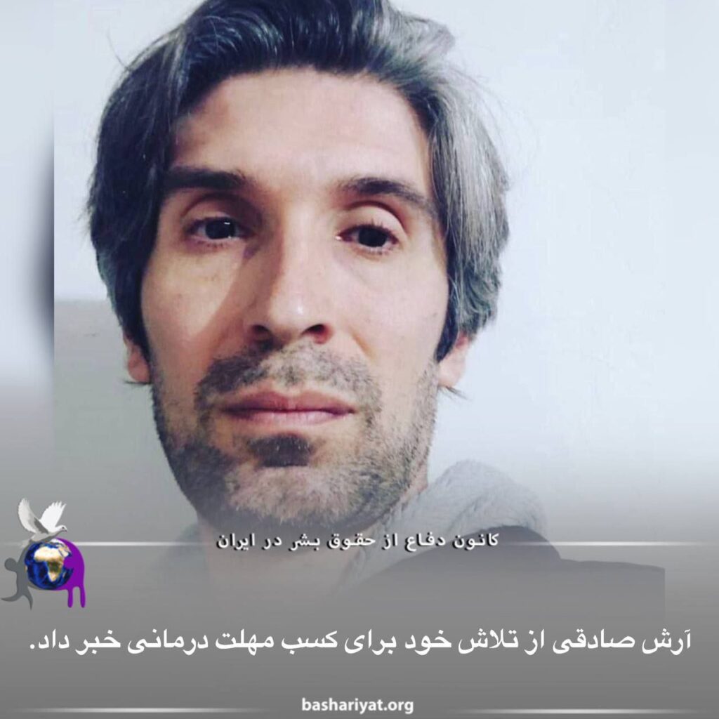 #آرش_صادقی فعال حقوق بشر،در شبکه اجتماعی اکس،نوشت:”با پیگیری وکیلم، نامهای برای پزشکی قانونی به همراه مدارک پزشکی مربوط به بیماری(کندرو سارکوم)ارائه شده،تا در صورت تایید برای طی مراحل درمانی،مهلت مشخصی را از اجرای احکام دریافت کنم.”آرش صادقی،توسط شعبه ۲۶ دادگاه انقلاب تهران،بابت اتهام”اجتماع و تبانی”به سه سال و هفت ماه حبس و “فعالیت تبلیغی علیه نظام”به هشت ماه حبس محکوم شده بود.وی همچنین،به دو سال ممنوعیت خروج از کشور،دو سال ممنوعیت عضویت در گروههای سیاسی،دو سال ممنوعیت حضور در فضای مجازی محکوم شده بود.
