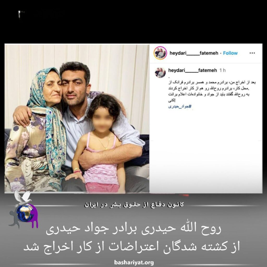 #فاطمه_حیدری، خواهر #جواد_حیدری، یکی از کشتهشدگان اعتراضات سراسری ۱۴۰۱ ایران، در اینستاگرامش از اخراج برادرش #روحالله_حیدری از کار خبر داده است.