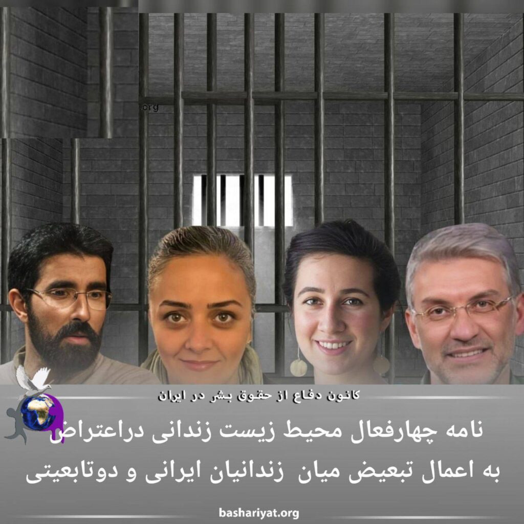#هومن_جوکار، #سپیده_کاشانی، #نیلوفر_بیانی، و #طاهر_قدیریان، فعالان زیست محیطی که در زندان اوین به سر میبرند، با نوشتن نامه ای به رئیس قوه قضاییه، اعتراض خود را نسبت به رد درخواست آزادی مشروط خود ابراز کردند.در این نامه ضمن انتقاد از اعمال تبعیض آمیز میان افراد دو تابعیتی و زندانیان ایرانی توسط دستگاه قضایی کشور، آمده است: شش ماه پیش #مراد_طاهباز، تنها فرد دو تابعیتی و نفر اول پرونده که به ۱۰ سال حبس محکوم شده بود، به گفته مسئولان کشور در اقدامی انسان دوستانه و با برخورداری از ارفاقات قانونی خوشبختانه آزاد شد. آیا قانونی که ما را محکوم کرده است، هنگام ارفاق و تخفیف تابعیت دوگانه را برتر می داند؟