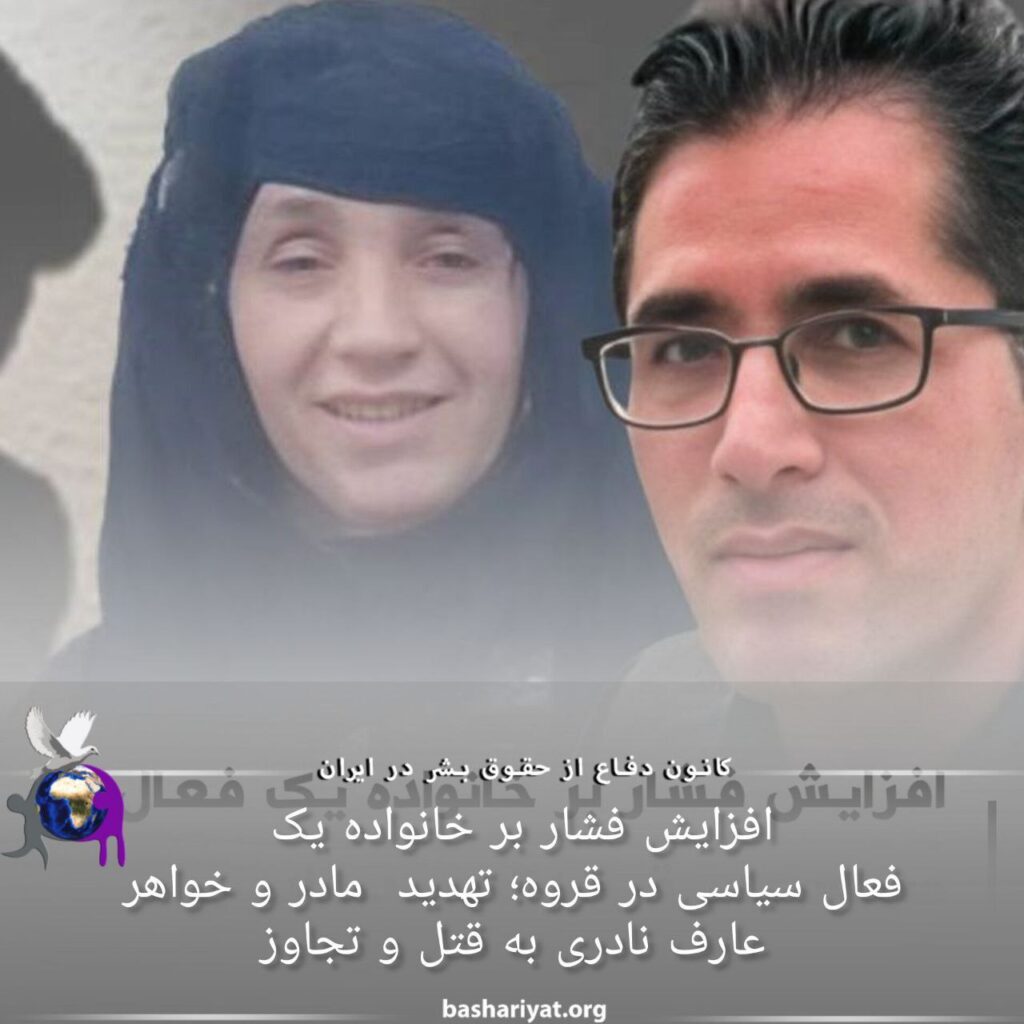 نهادهای حکومتی ایران در #قروه، به شکل غیرقانونی با برقراری تماس تلفنی با #محبوبه_عباسی، مادر و دو خواهر #عارف_نادری، #فعال_سیاسی #کرد و روزنامهنگار و عضو سابق شورای شهر قروه که طی سالهای گذشته به دلیل فشار نهادهای امنیتی ناچار به ترک زادگاه شده بود،را به مواردی مانند “ربودن، هتک حرمت و آتش زدن منزل مسکونی” تهدید کردهاند.روز ٢٣ مهر سال جاری، نیز #آمیار_فتحالهی، دانشآموز و خواهرزاده عارف نادری، با تماس فریبکارانه آموزشوپرورش قروه بازداشت و پس از انتقال به بازداشتگاه اداره اطلاعات این شهر، مورد #شکنجه قرار گرفت.آمیار فتحالهی، در بازدشتگاه بر اثر شکنجه جهت اخذ #اعتراف_اجباری، از ناحیه کلیه دچار خونریزی شد.