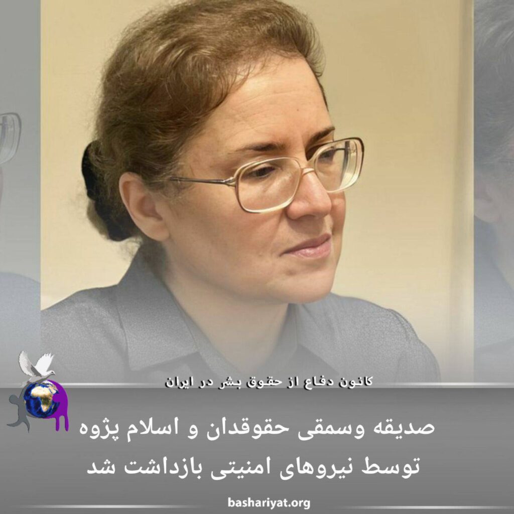 روز شنبە ٢٦ اسفند ١٤٠٢ (١٦ مارس ٢٠٢٤) نیروهای لباس شخصی با همراهی نیروهای امنیتی در تهران با هجوم به منزل خانوادگی #صدیقە_وسمقی اسلام پژوه و حقوقدان وی را بازداشت و بە مکان نامعلومی منتقل کردند.#محمد_ابراهیم زادە همسر صدیقه وسمقی نیز ضمن تایید خبر دستگیری، گفتە است، چهار مامور از طریق زنگ یکی از همسایهها وارد ساختمان شده و گفتند که اگر در را باز نکنید با شکستن آن وارد منزل میشویم.صدیقە وسمقی پیشتر در روز سەشنبە ١٥ اسفند ١٤٠٢، اعلام کرده بود که به دادسرای اوین احضار شده ولی در احضاریه به اتهامات و شاکی پرونده اشارهای نشده است.