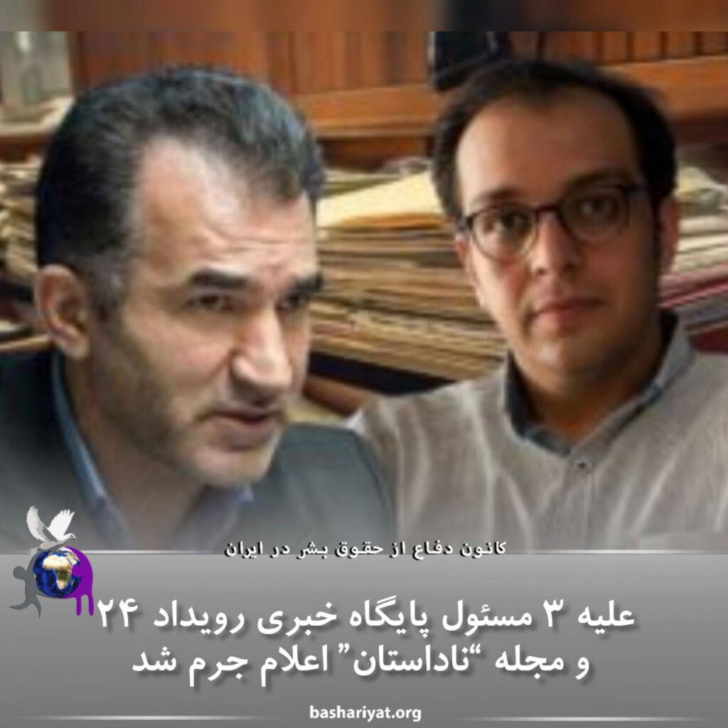 اعضای هیات منصفه شعبه نهم دادگاه کیفری یک تهران علیه #محمد_حیدری ، مدیر مسئول پایگاه خبری #رویداد_۲۴ ، #آرش_صادق_بیگی ، مدیر مسئول و صاحب امتیاز مجله #ناداستان و #مهدی_طلوعی ، سردبیر مجله مذکور اعلام جرم کردند.