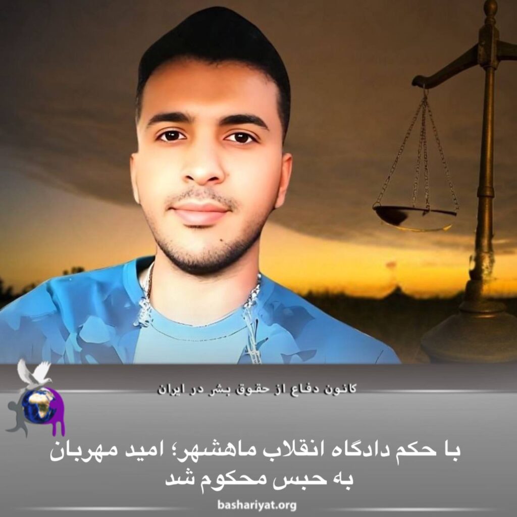 (امید)#محمدحسن_مهربان، شهروند اهل #بهبهان، توسط دادگاه انقلاب ماهشهر مجموعا به یک سال و ۹ ماه و دو روز حبس محکوم شد.سجاد چترسفید، وکیل دادگستری با انتشار مطلبی در این خصوص اعلام کرد: موکلم محمدحسن مهربان (امید مهربان) توسط دادگاه انقلاب ماهشهر بابت اتهام توهین به رهبر جمهوری اسلامی به یک سال و سه ماه و یک روز حبس و بابت اتهام تبلیغ علیه نظام به شش ماه و یک روز حبس، مجموعا یک سال و ۹ ماه و دو روز حبس محکوم شد. یک دوم مجازات اشد به مدت سه سال به حالت تعلیق درآمده است. این رای قابل تجدیدنظر خواهی است.