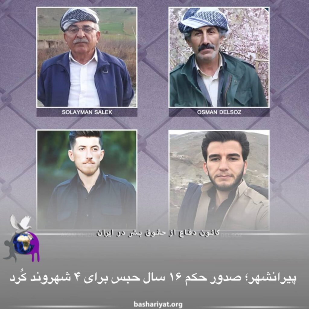 چهار شهروند کُرد از جمله دو فرد سالخورده به نامهای #عثمان_دلسوز ۶۶ ساله، #سلیمان_سالک ۷۳ ساله، #هژار_دلسوز (عبدالرحیم) و #آکام_خضرزاده هر دو ۳۰ ساله توسط دستگاه قضایی جمهوری اسلامی ایران جمعاً به ۱۶ سال حبس تعزیری محکوم شدند.