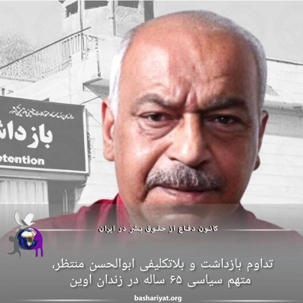 #ابوالحسن_منتظر، متهم سیاسی ۶۵ ساله علیرغم گذشت نزدیک به ۵ ماه از زمان دستگیری، کماکان به صورت بلاتکلیف در بازداشتگاه وزارت اطلاعات #زندان_اوین بسر میبرد. همچنین به دستور بازپرس شعبه ۵ دادسرای اوین تاکنون آزادی موقت وی میسر نشده است.وی در تاریخ یکم دی ماه سال گذشته، توسط نیروهای امنیتی در تهران بازداشت شد.آقای منتظر که به بیماری های قلبی ریوی کلیه مجاری ادراری و آرتروز مبتلاست به رسیدگی تخصصی پزشکی نیاز دارد و این امر در بازداشتگاه مذکور میسر نیست.تا کنون از دلایل بازداشت و اتهامات مطروحه علیه آقای منتظر اطلاعی حاصل نشده است.