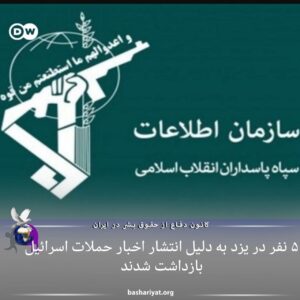 روابط عمومی دادگستری یزد اعلام کرد، پنج شهروند به دلیل فیلمبرداری از حملات اسرائیل به ایران و انتشار اخبار مرتبط با این درگیری در فضای مجازی، توسط ماموران سازمان اطلاعات سپاه در این استان بازداشت شدند.
