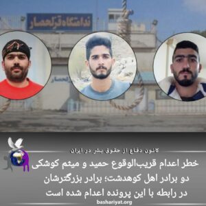 #حمید و #میثم_کوشکی، دو برادر اهل #کوهدشت استان #لرستان که به اتهام قتل یک بسیجی به #اعدام محکوم شده بودند، در خطر اجرای قریبالوقوع حکم اعدام قرار دارند. این در حالی است که #فرمان_کوشکی، برادر دیگرشان، سحرگاه ۴ خرداد ۱۴۰۴ (۲۵ می ۲۰۲۵) در ارتباط با همین پرونده در #زندان_قزلحصار اعدام شد.