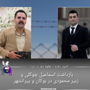 دو شهروند #کرد بە نامهای #اسماعیل_چوکلی، اهل #بوکان و #زبیر_محمودی اهل #پیرانشهر، توسط نیروهای ادارە اطلاعات جمهوری اسلامی ایران بازداشت و به مکان نامعلومی منتقل شدند.