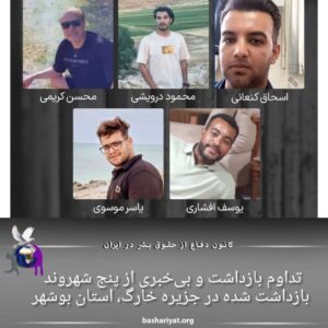 در ۸ تیر ۱۴۰۴، پنج شهروند #جزیره_خارک توسط نیروهای امنیتی بدون حکم قضایی بازداشت و به #بوشهر منتقل شدند. بازداشتیها شامل #محسن_کریمی، #محمود_درویشی، #یاسر_موسوی، #اسحاق_کنعانی و #یوسف_افشاری هستند.