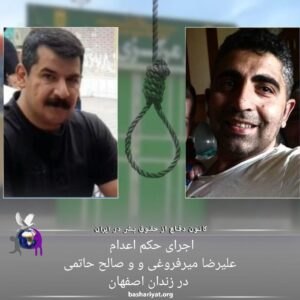 یکشنبه ۵ مردادماه ١٤٠٤ ، حکم اعدام #علیرضا_میرفروغی، ۴۶ ساله و اهل #اصفهان و #صالح_حاتمی، ۳۷ ساله، پدر یک کودک و اهل #مسجدسلیمان استان #خوزستان در #زندان_مرکزی_اصفهان اجرا شد.