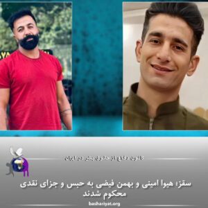 #هیوا_امینی و #بهمن_فیضی، دو فعال مدنی و زیستمحیطی اهل #سقز توسط دستگاه قضایی جمهوری اسلامی ایران محکوم شدند. هیوا امینی و بهمن فیضی، اهل سقز توسط دادگاه انقلاب سقز با ریاست مجتبی غفاری هریک بابت اتهام “تبلیغ علیه نظام” به ۵ ماه زندان، در مجموع ١٠ ماه حبس محکوم شدند. این حکم برای دو سال به حالت تعلیق درآمده است.