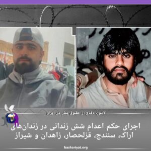 حکم اعدام شش زندانی با اسامی #جاسم_نوری، #اکبر_عباسپور، #سلیمان_کوشکی، #حامد_براهویی، #آرمان_ریحانی و #اسماعیل_دلاور، کە پیشتر بابت اتهامات “قتل عمد” و “مرتبط با جرائم مواد مخدر”، توسط دستگاه قضایی جمهوری اسلامی ایران به اعدام محکوم شده بودند، در زندانهای سنندج(سنە)، قزلحصار، زاهدان و شیراز اجرا شده است.