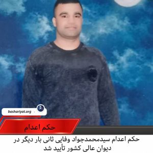 حکم #اعدام #سید_محمد_جواد_وفایی_ثانی زندانی سیاسی محبوس در #زندان #وکیلآباد_مشهد، که پیشتر نقض شده بود، این بار در شعبه نهم دیوان عالی کشور به ریاست قاضی مزینانی، تأیید شد.