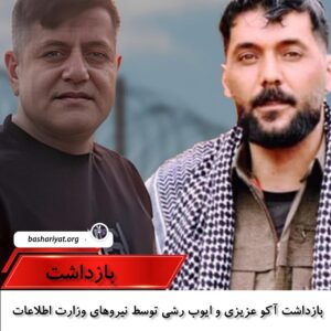 دو شهروند کورد اهل سردشت به نامهای آکوعزیزی و ایوب رشی توسط نیروهای وزارت اطلاعات جمهوری اسلامی ایران بازداشت شدند.