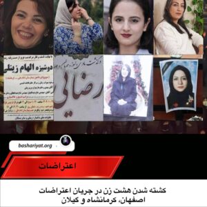 به نامهای #ملیکاشاهمرادی، #الهام_زینلی، #طیبەرضایی، #پریساتقیبی، #پروانه_خُجندیراد، #فاطمه_طبیبی، #نیلوفرمسعودی و #زهرا_محمودپور در جریان اعتراضات مردمی در کرمانشاه(کرماشان)، گیلان و اصفهان کشتە شدند. با احتساب این موارد شمار زنان کشته شده در این اعتراضات به ٤٢ نفر رسید.