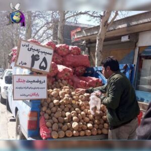 در این تصویر، یک فروشنده سیار در حال فروش سیبزمینی دیده میشود که روی برگهای نوشته است: «در شرایط جنگی برای افراد نیازمند رایگان است.»
