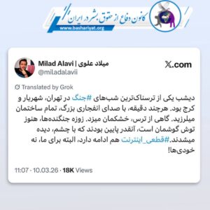 #میلاد_علوی خبرنگار از شب ۱۹ اسفند ۱۴۰۴ به عنوان یکی از ترسناکترین شبهای جنگ در #تهران #شهریار و #کرج یاد کرد