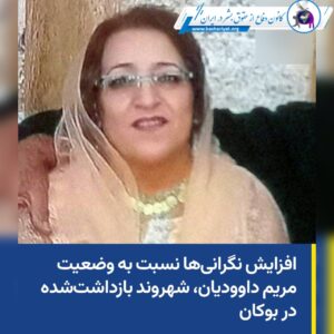 #مریم_داوودیان، شهروند ۵۸ ساله، پس از احضار به ستاد خبری #اداره_اطلاعات #بوکان در ۳۱ فروردین ۱۴۰۴ بازداشت و به زندان مرکزی ارومیه منتقل شده و همچنان در بلاتکلیفی به‌سر می‌برد. او بیمار است و خانواده‌اش نگران عدم دسترسی او به داروهای ضروری هستند.