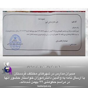 مدیران مدارس در شهرهای مختلف کُردستان با ارسال نامه به والدین دانش‌آموزان خواستار حضور آنها در مراسم حکومتی ۲۲ بهمن‌ شده‌اند