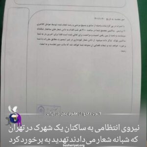 تصویر و پیام دریافتی: «سلام. شهرکی در شرق تهران که هر شب مردم شعار میدن امروز نیرو انتظامی محل اومده رو تابلو اعلانات همه