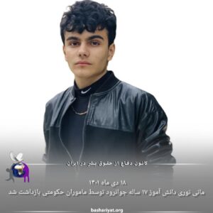 مانی نوری، دانش‌آموز ۱۷ساله اهل جوانرود، یک‌شنبه ۱۸دی ۱۴۰۱ توسط ماموران حکومتی بازداشت و سرنوشتش نامعلوم است.