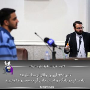 ۷اذر۱۴۰۱ آوردن چاقو توسط نماینده دادستان در دادگاه و نسبت دادن آن به #مجیدرضا_رهنورد، یادآور اعتراف گیری