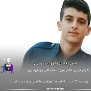 #کاردو_ مرادی، دانش‌آموز ۱۶ ساله اهل جوانرود، روز چهارشبه ۲۵ آبان ۱۴۰۱ توسط نیروهای حکومتی ربوده شده