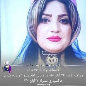 «سمانه نیکنام، ۳۶ ساله روزسه شنبه ۲۴ آبان ماه در معالی اباد شیراز ربوده شده، پس از آنکه