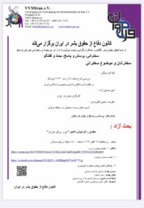 فراخوان جلسه عمومی کانون دفاع از حقوق بشر درایران     در تاریخ یکشنبه ۱۳ اکتبر ۲۰۲۴   ساعت ۱۵:۰۰ به وقت اروپای مرکزی   ساعت ۱۶:۳۰ به وقت ایران   کانون دفاع از حقوق بشر در ایران