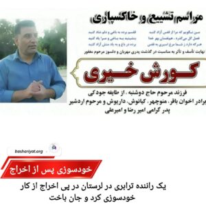 #کورش_خیری، راننده ترابری اداره آموزش و پرورش #لرستان، پس از اخراج از محل کار خود اقدام به خودسوزی کرد. ادامهی مطلب