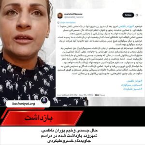 پس از ۱۰ روز بیخبری، خواهر #پوران_ناظمی از تماس یک دقیقهای او خبر داد. به گفته #مهشیدناظمی، وضعیت جسمی پوران بسیار وخیم است و از خانواده خواسته مدارک پزشکیاش را به وکیل تحویل دهند.