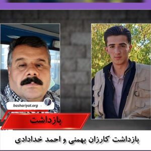 دو شهروند کورد به نامهای #کارزان_بهمنی و #احمد_خدادادی در مهاباد و پیرانشهر توسط نیروهای حکومتی جمهوری اسلامی ایران بازداشت و به مکانهای نامعلومی منتقل شدند.